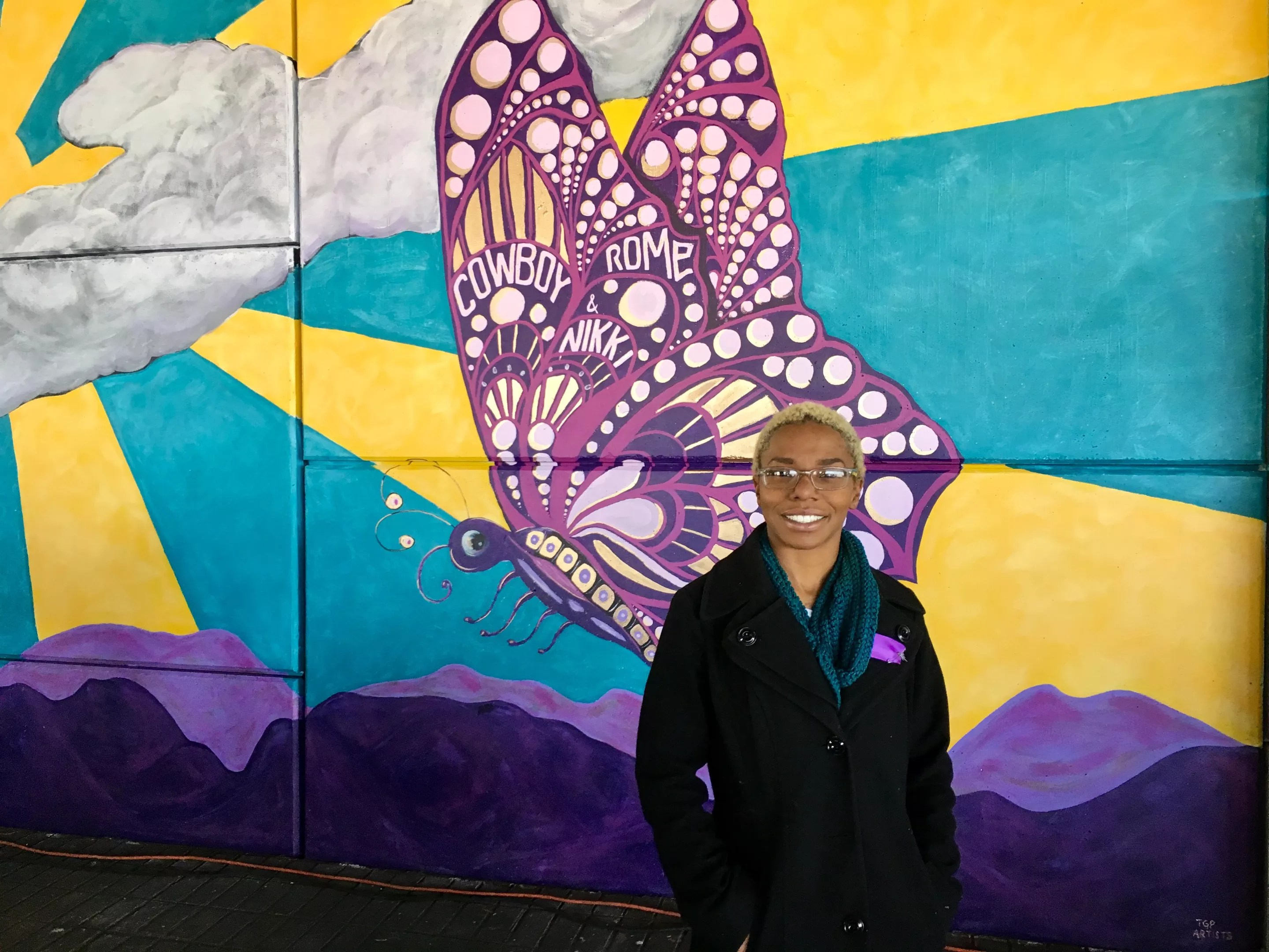 A mural of a bright purple butterfly rising above a mountain range into a yellow and blue sky underneath the Interstate 25 and Broadway interchange pops out amid gray concrete slabs. While the new art may look straightforward enough to drivers zooming past it on Broadway, there is more to the artwork than initially meets the eye. Look carefully at the butterfly and you’ll notice there are three names written upon the creature’s body: Nikki, Rome and Cowboy.