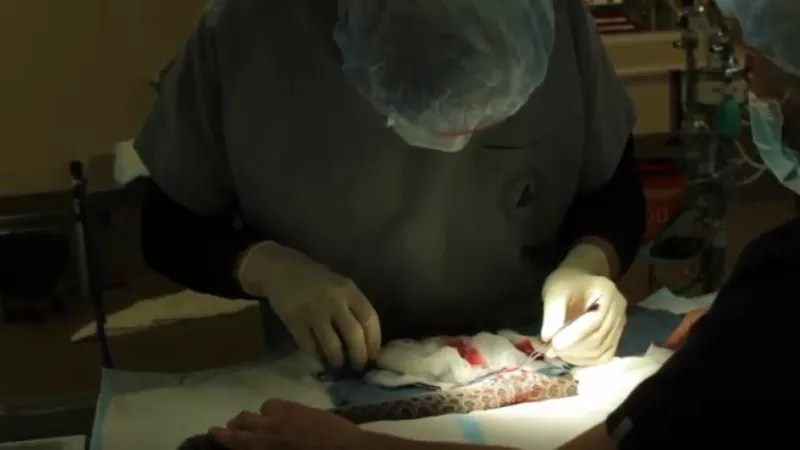 Dr. Kevin Fitzgerald implanting a radio transmitter in a prairie rattlesnake.