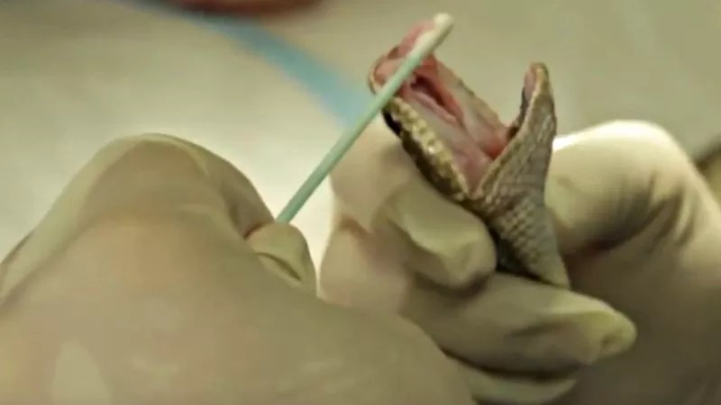 Dr. Kevin Fitzgerald taking a culture from a prairie rattlesnake’s mouth to determine what kinds of bacteria are living there.