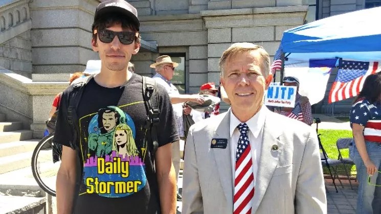 Yeakel made no such gestures when he posed alongside state senator Kevin Lundberg at a pro-Donald Trump rally at the Colorado State Capitol last July 4. Instead, he stood with his arms at his side while proudly sporting a Daily Stormer T-shirt.