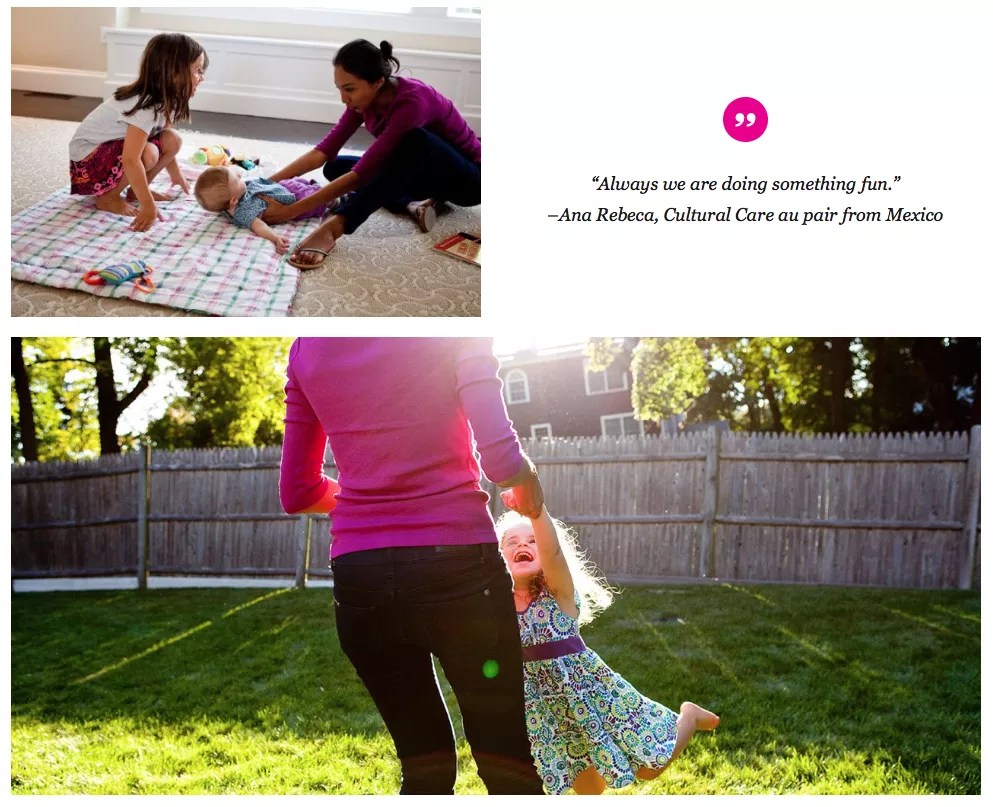 Sponsor agency websites promote the U.S. au pair program as a rewarding experience for applicants from around the world, as seen in this screenshot.