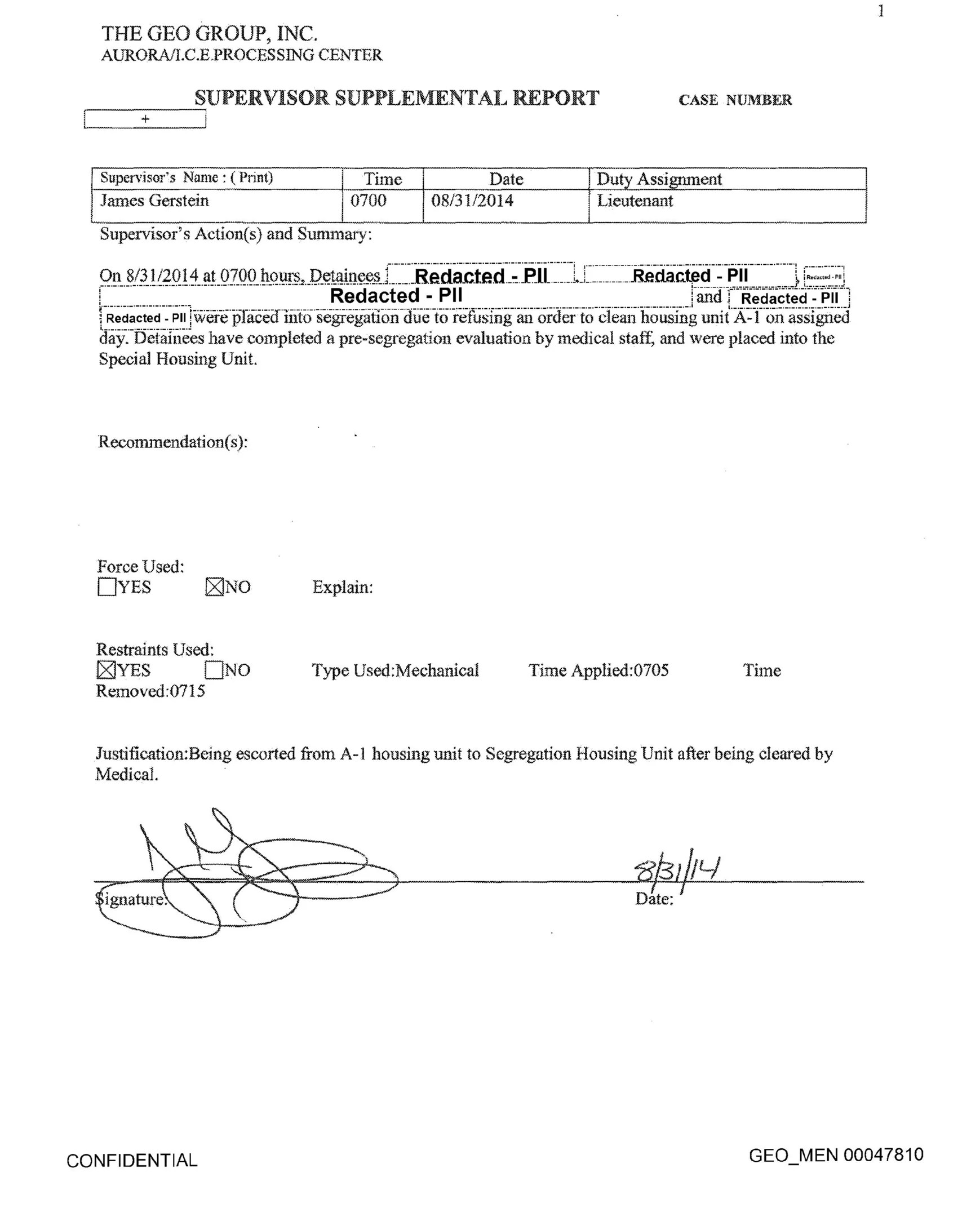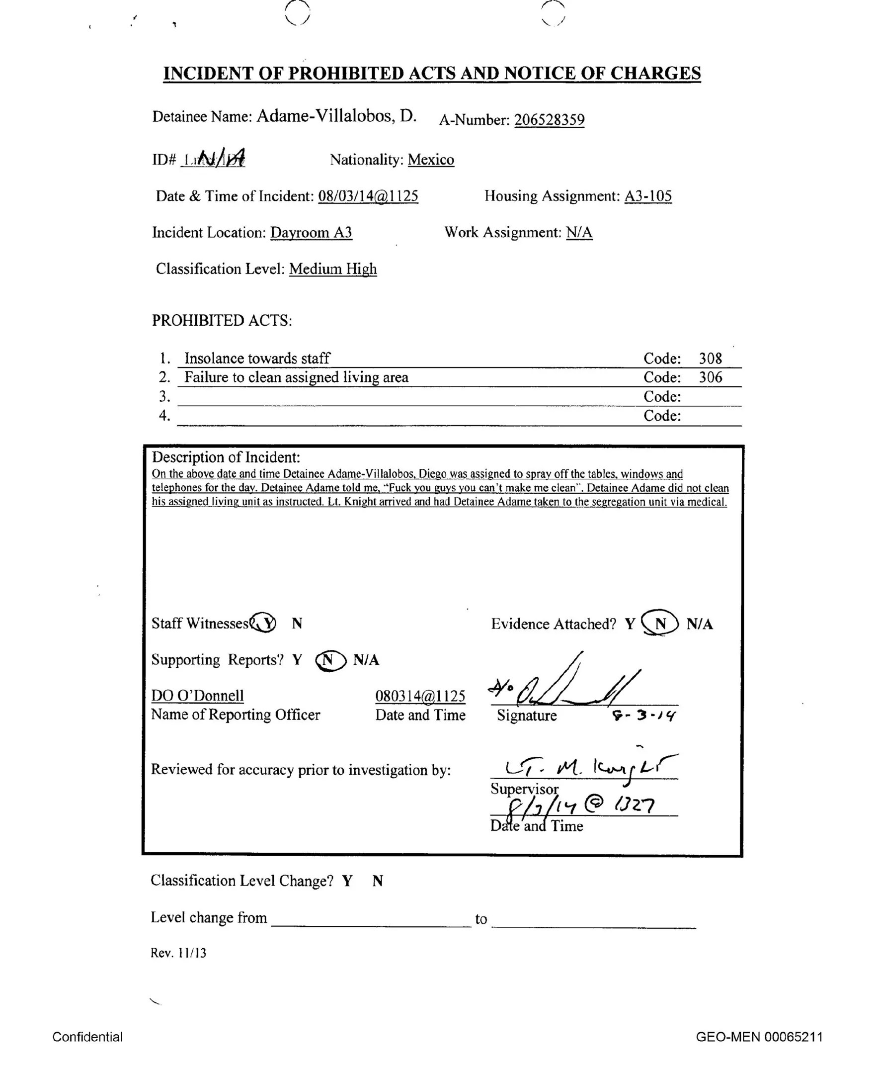 An Aurora GEO facility disciplinary report from August 3, 2014.