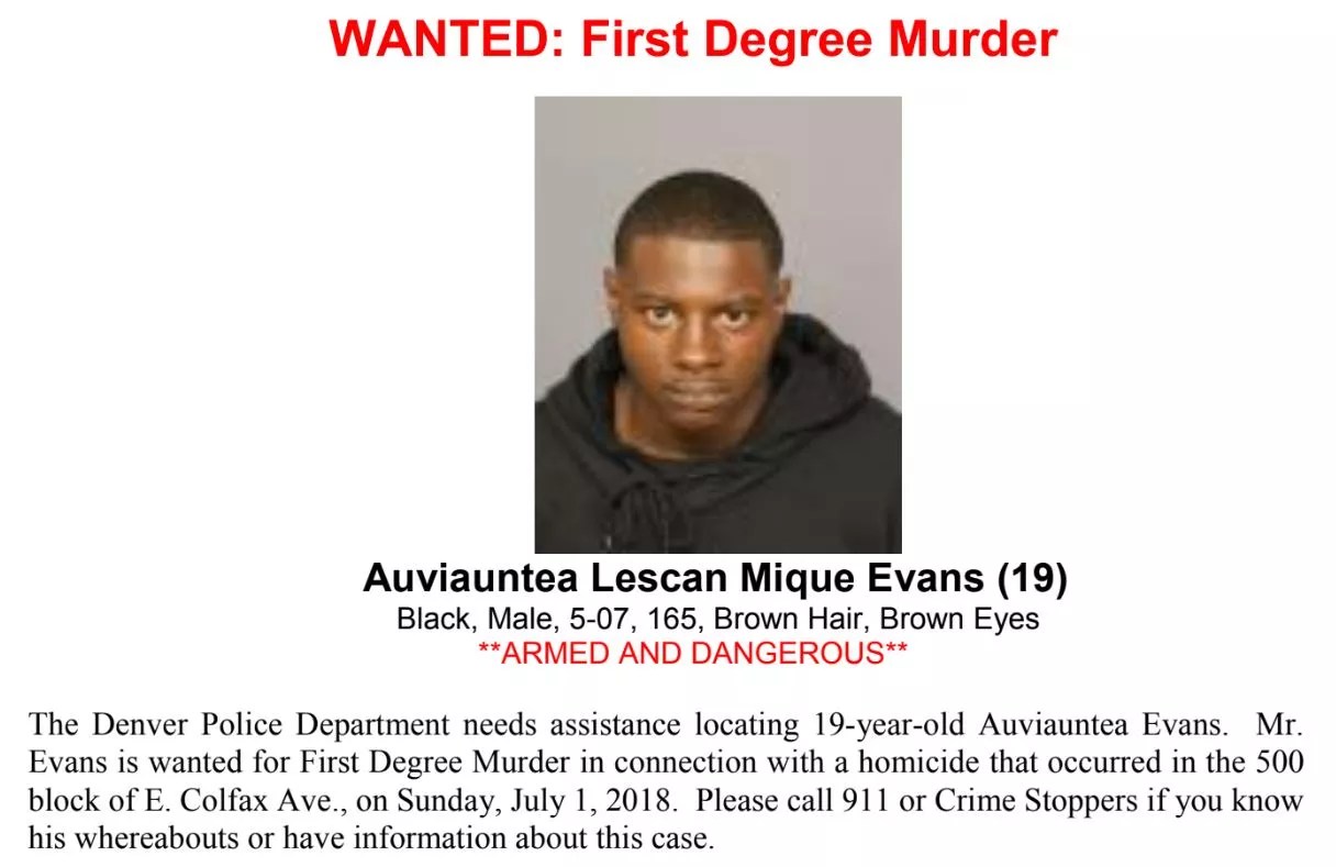 If you have any information about his whereabouts or have a tip about the homicide case, contact Metro Denver Crime Stoppers at 720-913-7867. The Denver Police say that all of the other individuals they were searching for in connection to the killing have been located; none are in custody.