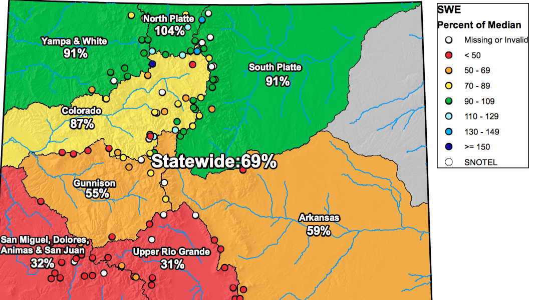 Colorado wildfire officials are primarily alarmed by paltry snowpack levels, especially in the southwestern parts of the state, where levels are less than a third of where they should be, according to data from the National Resources Conservation Service (shown below). Statewide, snowpack was less than 70 percent of where it should be as of last week, with only the North Platte river basin above average among the state’s eight major river basins.