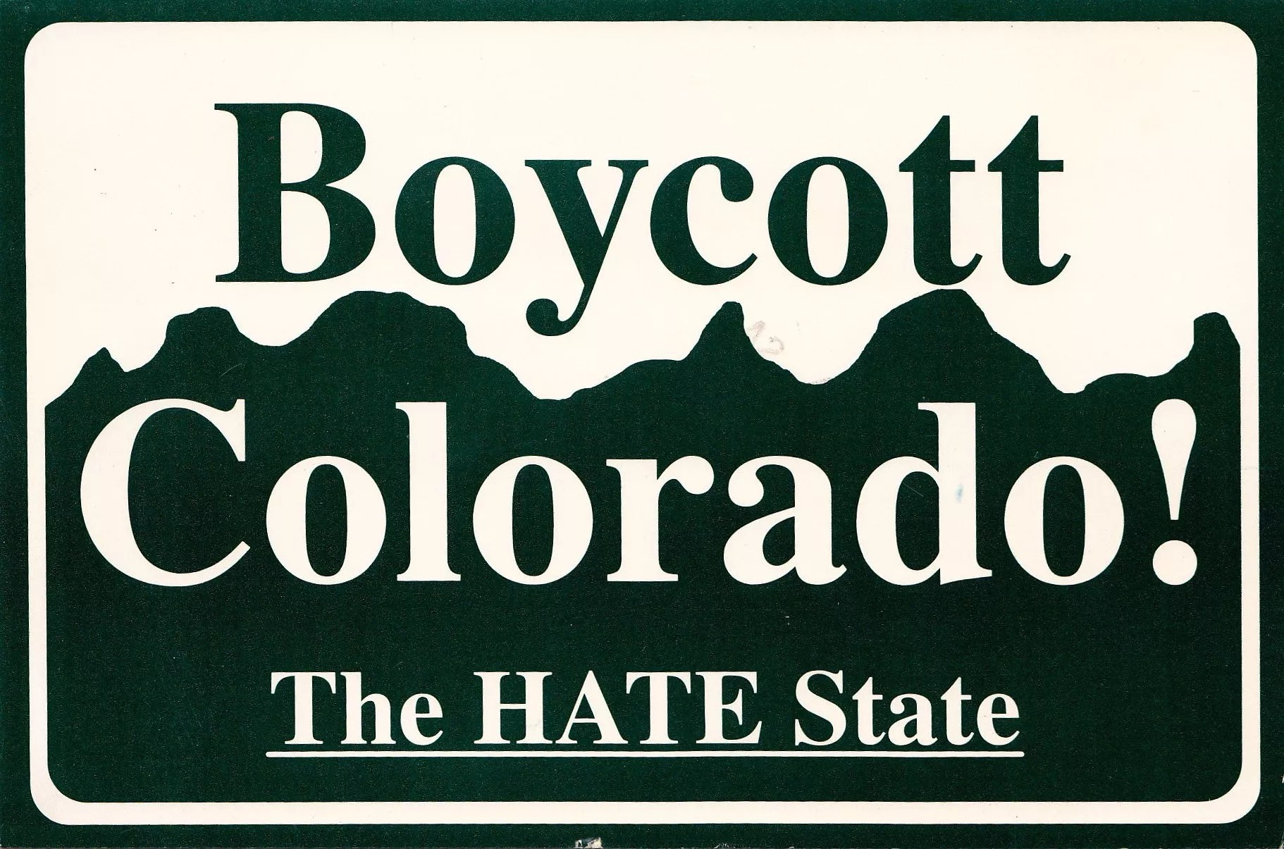 This amendment to the state constitution banned municipalities from enacting anti-discrimination laws protecting, gay, lesbian or bisexual people, and earned Colorado the nickname “The Hate State” as well as boycotts by supporters of LGBT rights. The amendment was ultimately declared unconstitutional by the U.S. Supreme Court in 1996.