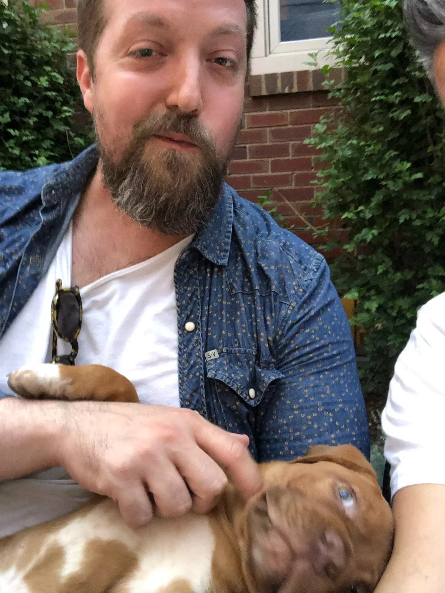 Blue Pan Pizza worker Nick Cordova petting a puppy.