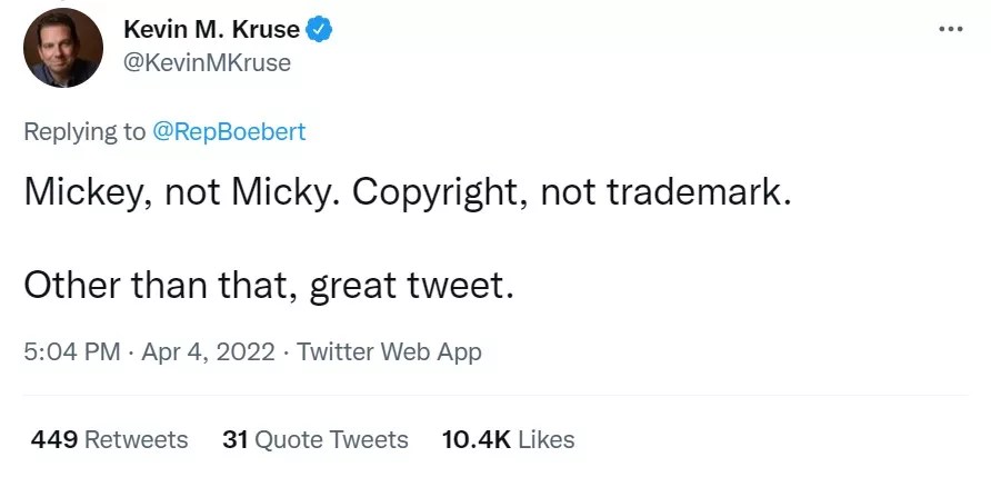 Which, of course, immediately brought responses from people who pointed out the misspelling of the name of the world’s most famous mouse, as well as some intellectual property confusion. Writer and historian Kevin M. Kruse tweeted “Mickey, not Micky. Copyright, not trademark. Other than that, great tweet.”