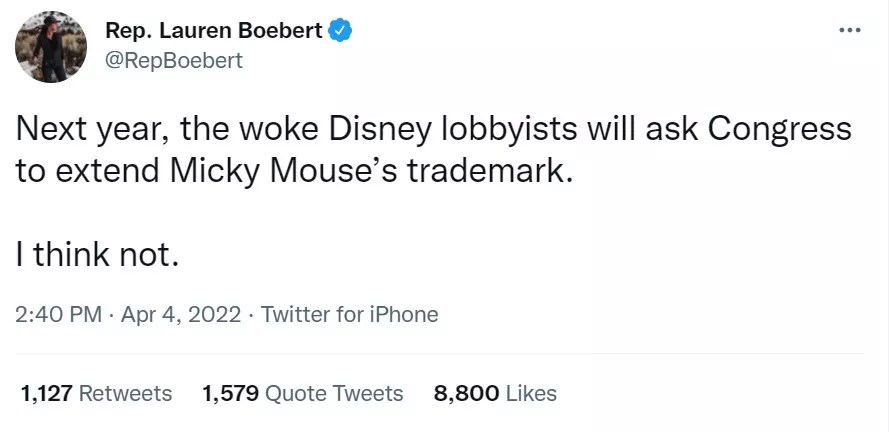 After that, Boebert, never one to shy away from stepping into an issue that she doesn’t fully understand, tweeted this: “Next year, the woke Disney lobbyists will ask Congress to extend Micky Mouse’s trademark.I think not.”
