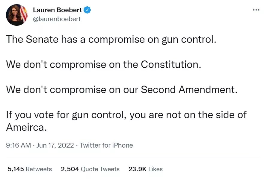 Lauren Boebert’s latest cry for attention is as poorly edited as it is tone-deaf: On July 14, she introduced a bill called the “Shall Not Be Infringed Act,” which intends to undo the “Bipartisan Safer Communities Act” that President Joe Biden recently signed into law as a step toward addressing the epidemic of gun violence in America. Boebert’s announcement of her own proposal accuses those Republicans who supported even that minor move toward reasonable gun law as RINOs who “failved [sic] to defend the Second Amendment.”