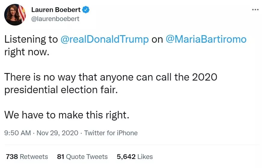 Perhaps Boebert’s biggest piece of disinformation is the one she’s taken like foul orange communion from Trump himself: that the 2020 election was stolen. “There is no way that anyone can call the 2020 presidential election fair,” she tweeted. “We have to make this right.” She continued to claim everything from “voting irregularities” to outright fraud, depending on her audience, and still does to this day, despite all evidence to the contrary. Here’s how historian Timothy Snyder, author of the book On Tyranny, explained the power and threat of the Big Lie to CNN in the wake of the January 6 insurrection: “It’s a big lie because you have to disbelieve all kinds of evidence to believe in it. It’s a big lie because you have to believe in a huge conspiracy in order to believe it. And it’s a big lie because, if you believe it, it demands you take radical action.”