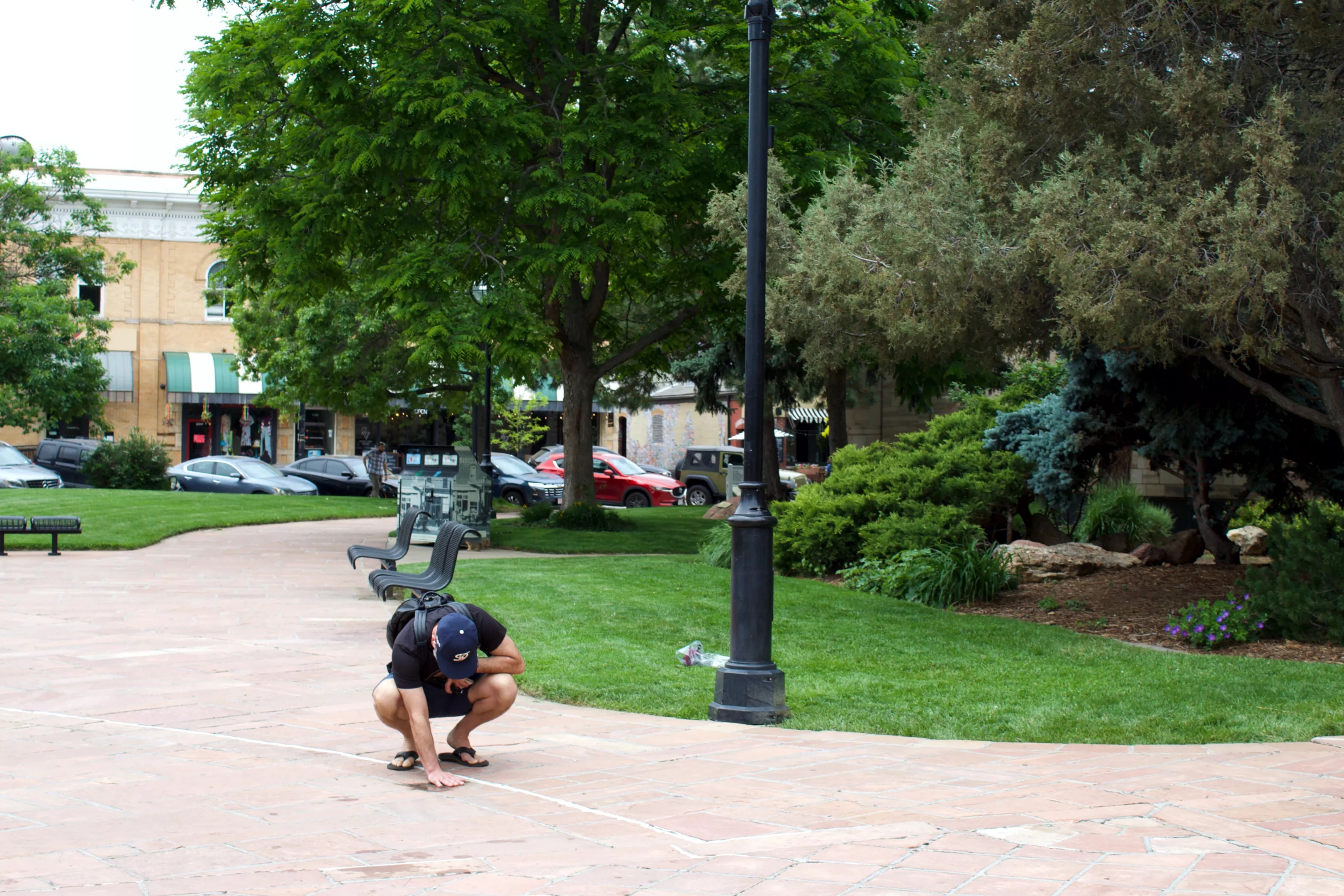 A man kneels over the spot where a victim was burned during a hate crime attack on Pearl Street in Boulder.