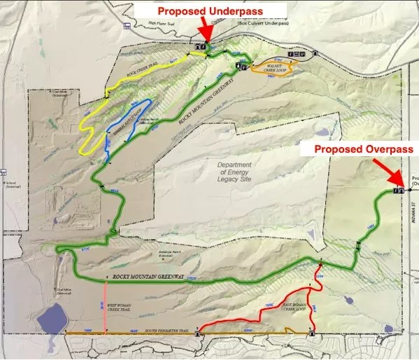 The Rocky Mountain Greenway Project, which is already partially built, will connect existing trails and build new ones to create a continuous path from the Rocky Mountain Arsenal National Wildlife Refuge in Commerce City past Rocky Flats to Boulder and, eventually, even farther north to Rocky Mountain National Park. Over the past six months, the governments involved – including the City of Boulder, Boulder County, Arvada, Westminster and Jefferson County – have been asked to approve funding for a relatively small portion of the overall project: an underpass beneath State Highway 128 and an overpass above Indiana Street.