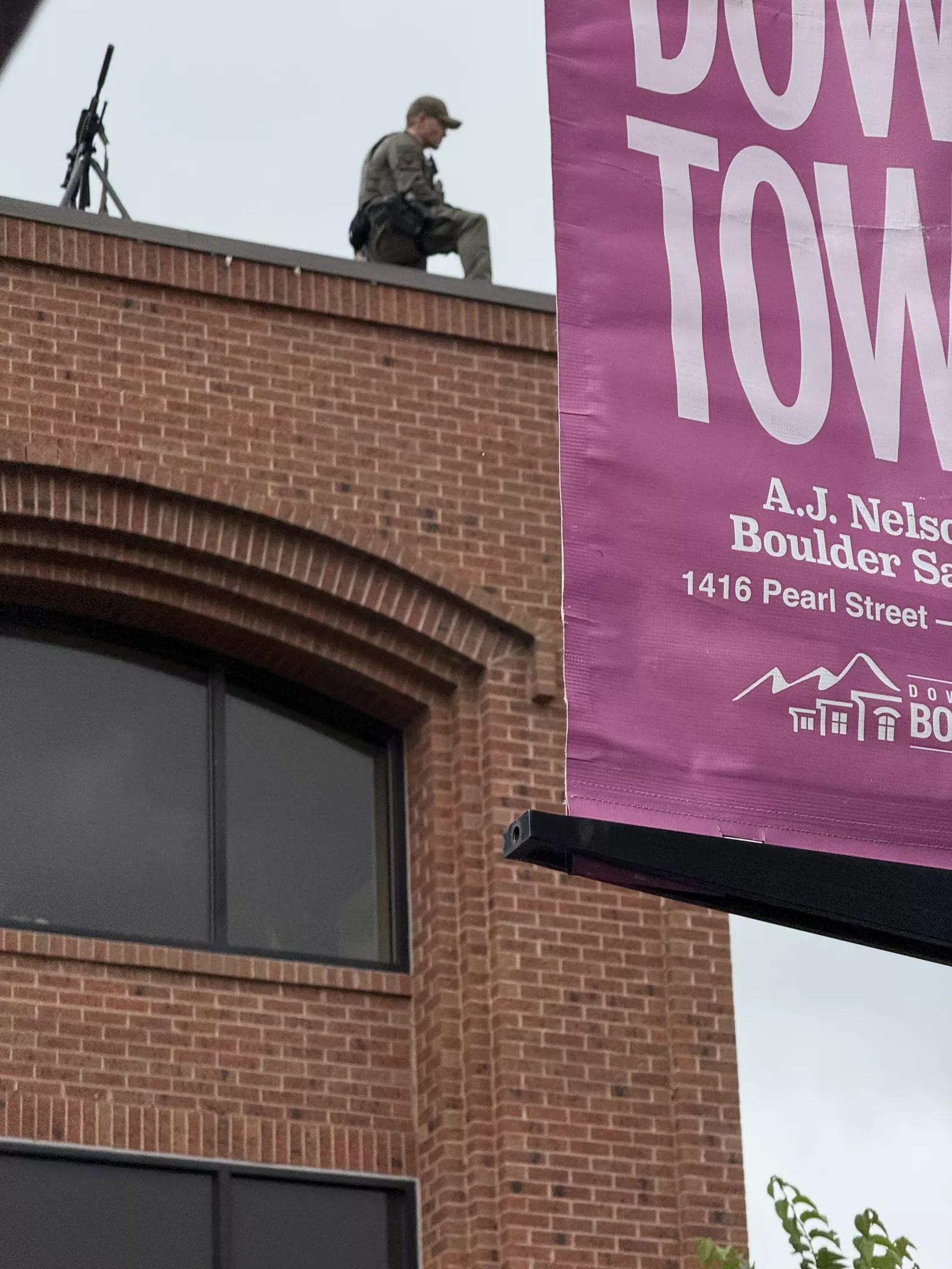 Uniformed law enforcement was thick on the Pearl Street Mall, and a Boulder police officer said that the visible presence was just the tip of the iceberg. Snipers with rifles on tripods were posted on the roof of the historic Boulder Courthouse, as well as the brick retail building across the square. “We like to call [the snipers] ‘overwatch,'” Boulder Police Chief Stephen Redfearn told Westword.