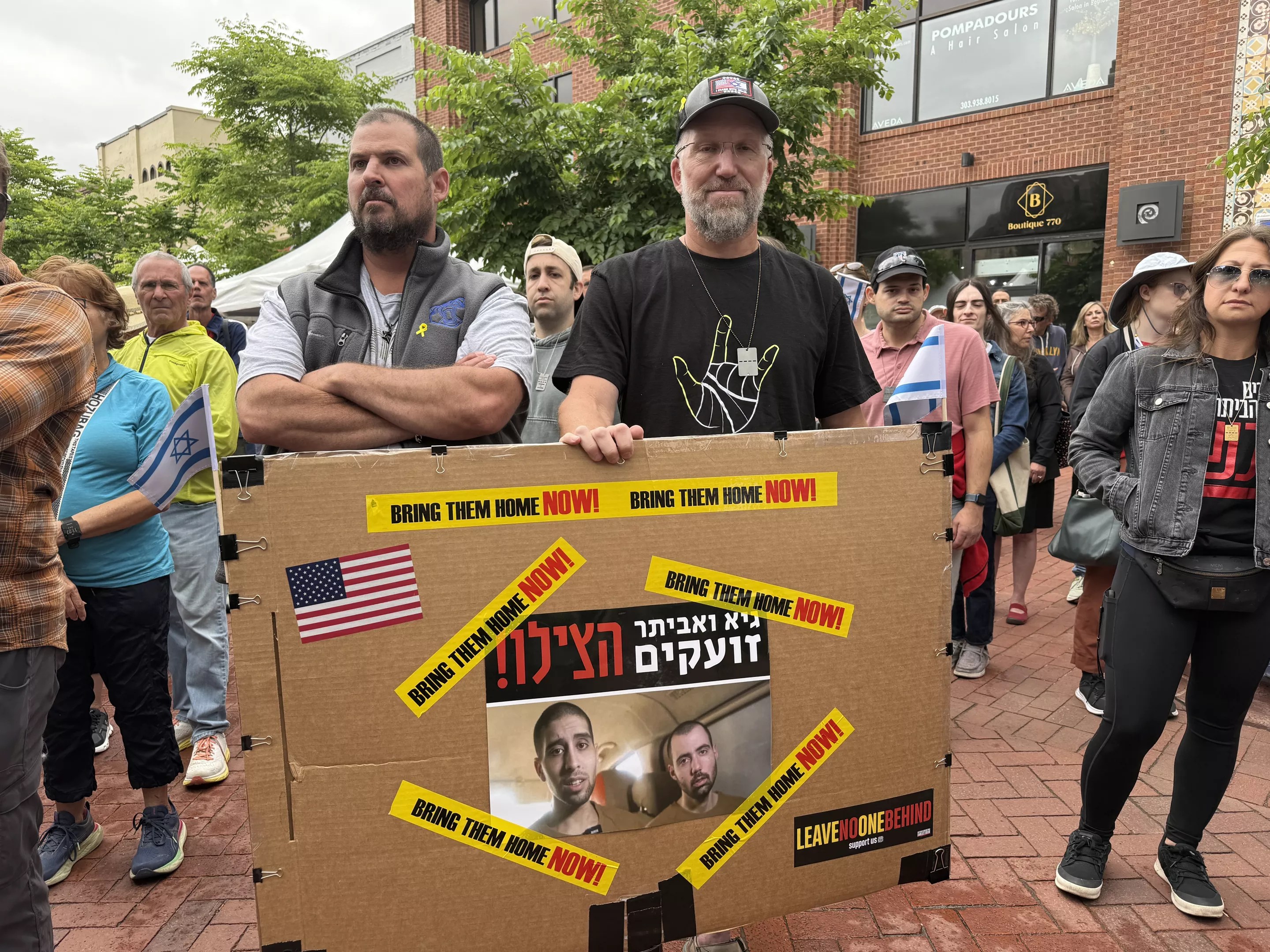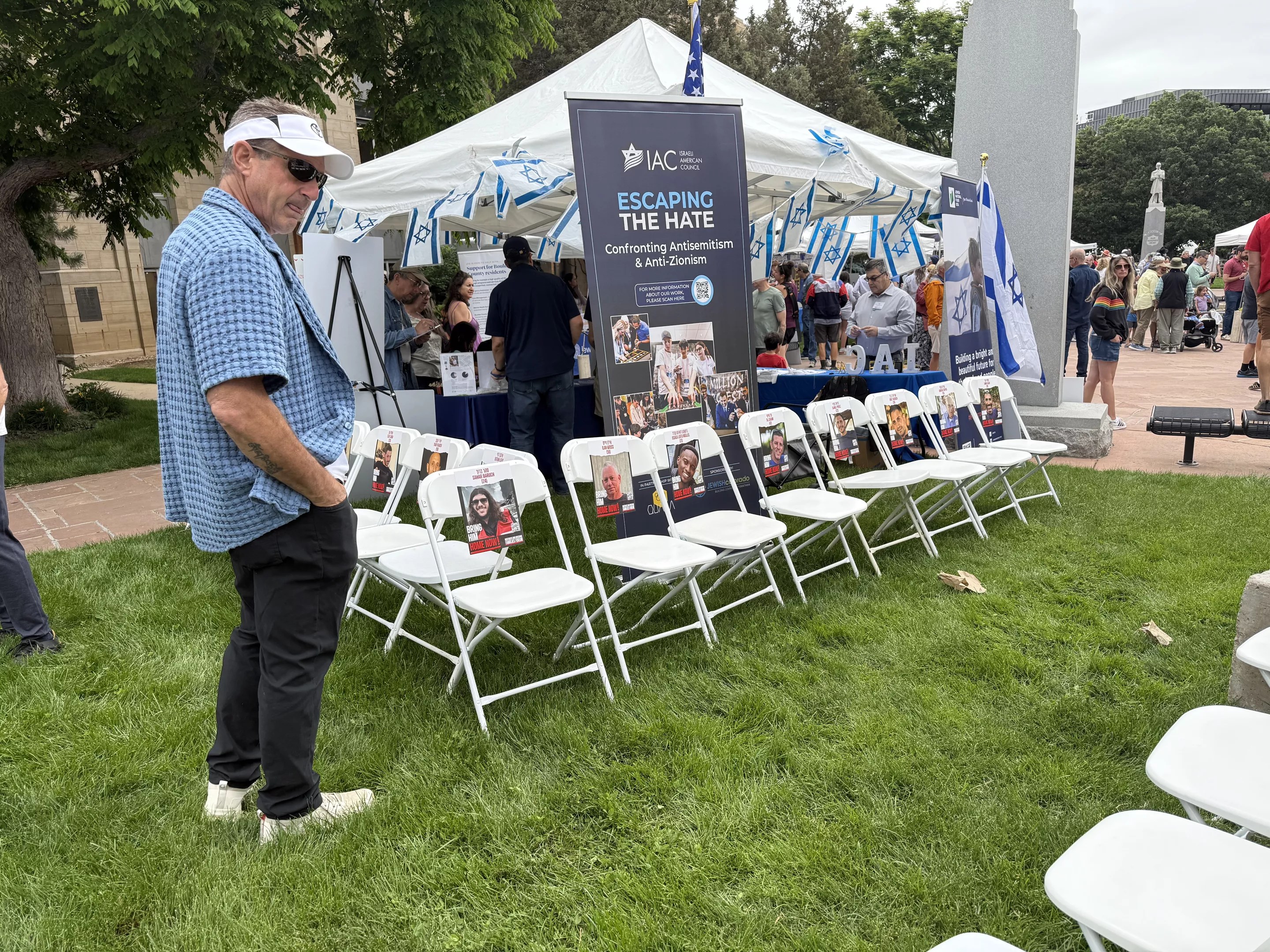 An attendee at the Boulder Jewish Festival held a sign with images of two hostages still held in Gaza.