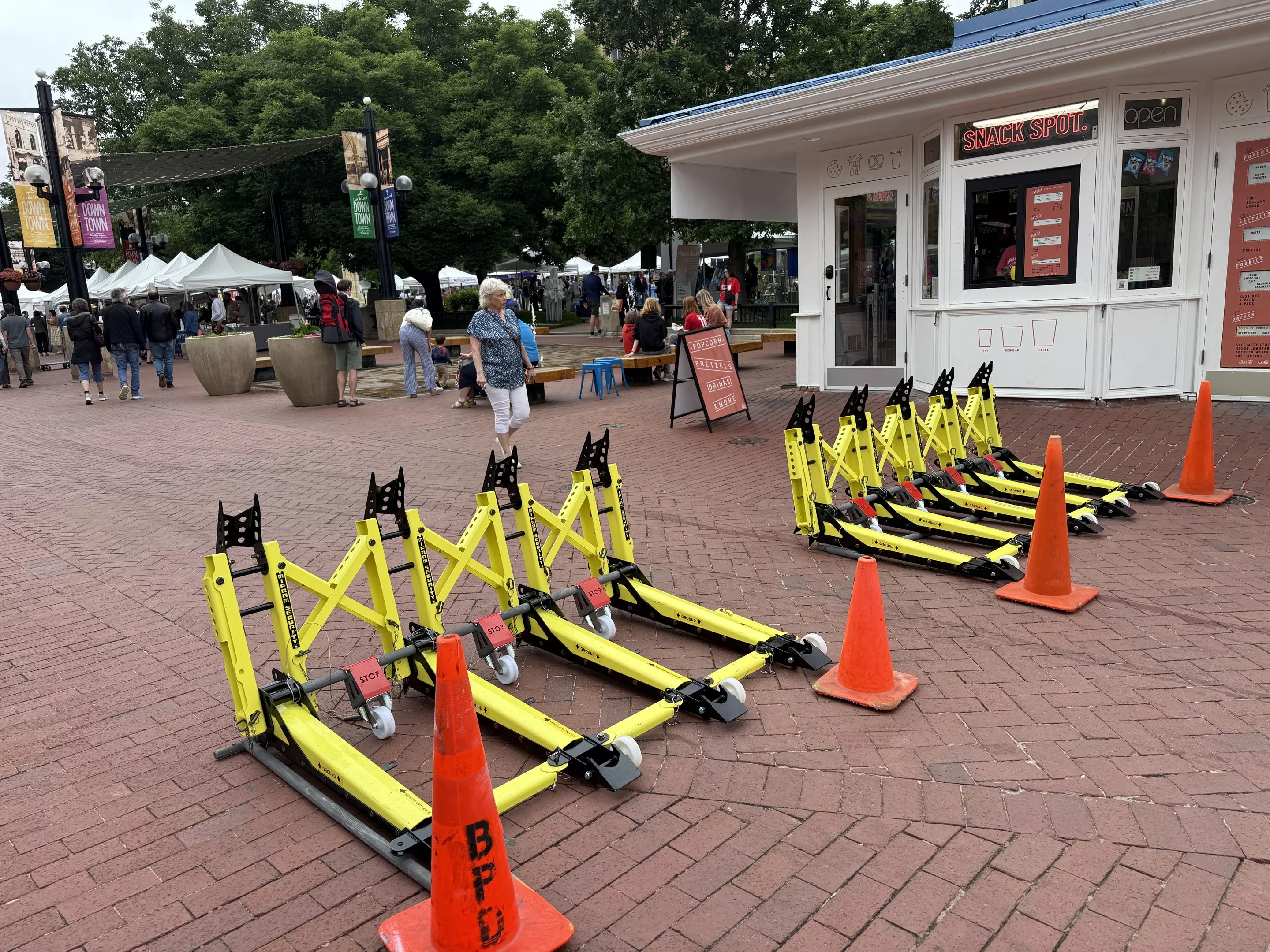 Anti-vehicle devices guarded both ends of the Pearl Street Mall.