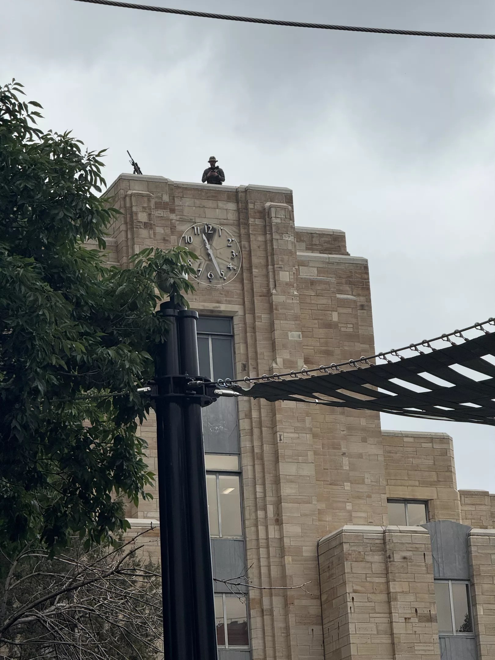 A sniper and his rifle atop the historic Boulder County Courthouse.