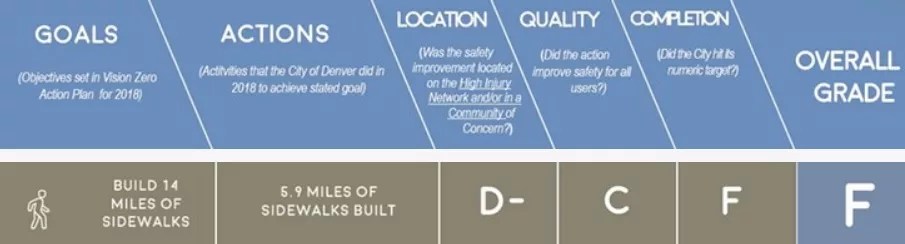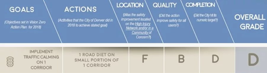 The report card looks at eight major Vision Zero components and grades the city’s progress toward its goals in four categories for each. The “Actions,” “Quality” and “Completion” groupings are self-explanatory, while “Location” refers to where projects were based, with Denver typically downgraded if they were outside what’s been designated as the “high-injury network” or a so-called “community of concern.” The former consists of what van Heuven calls “the 5 percent of the street network where 50 percent of the fatalities happen.” (Major arterials such as Colfax Avenue, Hampden Avenue, Alameda Avenue, Federal Boulevard and Colorado Boulevard are all on the list.) The latter are neighborhoods where a lack of infrastructure makes alternative forms of transportation such as walking or cycling difficult; they include Montbello, Green Valley Ranch, Globeville, Elyria-Swansea and suburban areas in southeast and southwest Denver.