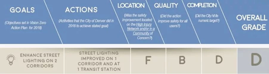 “A HAWK signal was part of the Brighton Boulevard redesign; it was put at Brighton and 35th, which is a good location with all of the redevelopment happening in the area. But Brighton didn’t pop up as a street in the high-injury network. And they did put a flashing beacon in the Montbello location. So we’re allowing them to count something twice – but we still gave them a D for location.”