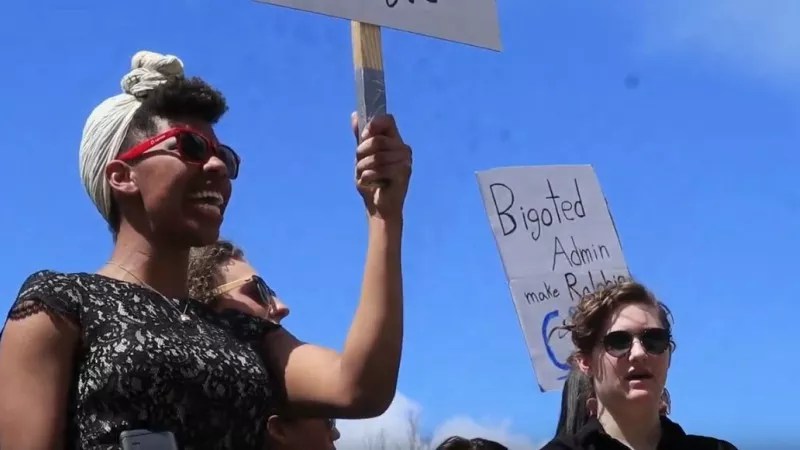 Participants in an April 15 rally against naming Mark Kennedy as the sole finalist for the position of University of Colorado president.