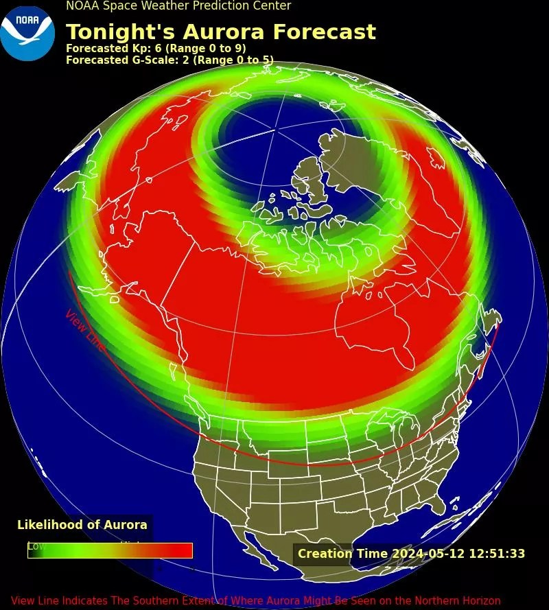 “The brightness and location of the aurora is typically shown as a green oval centered on Earth’s magnetic pole,” reports the center. “The green ovals turn red when the aurora is forecasted to be more intense. Aurora can often be observed somewhere on Earth from just after sunset or just before sunrise. The aurora is not visible during daylight hours. The aurora does not need to be directly overhead but can be observed from as much as 1000 km away when the aurora is bright and if conditions are right.”