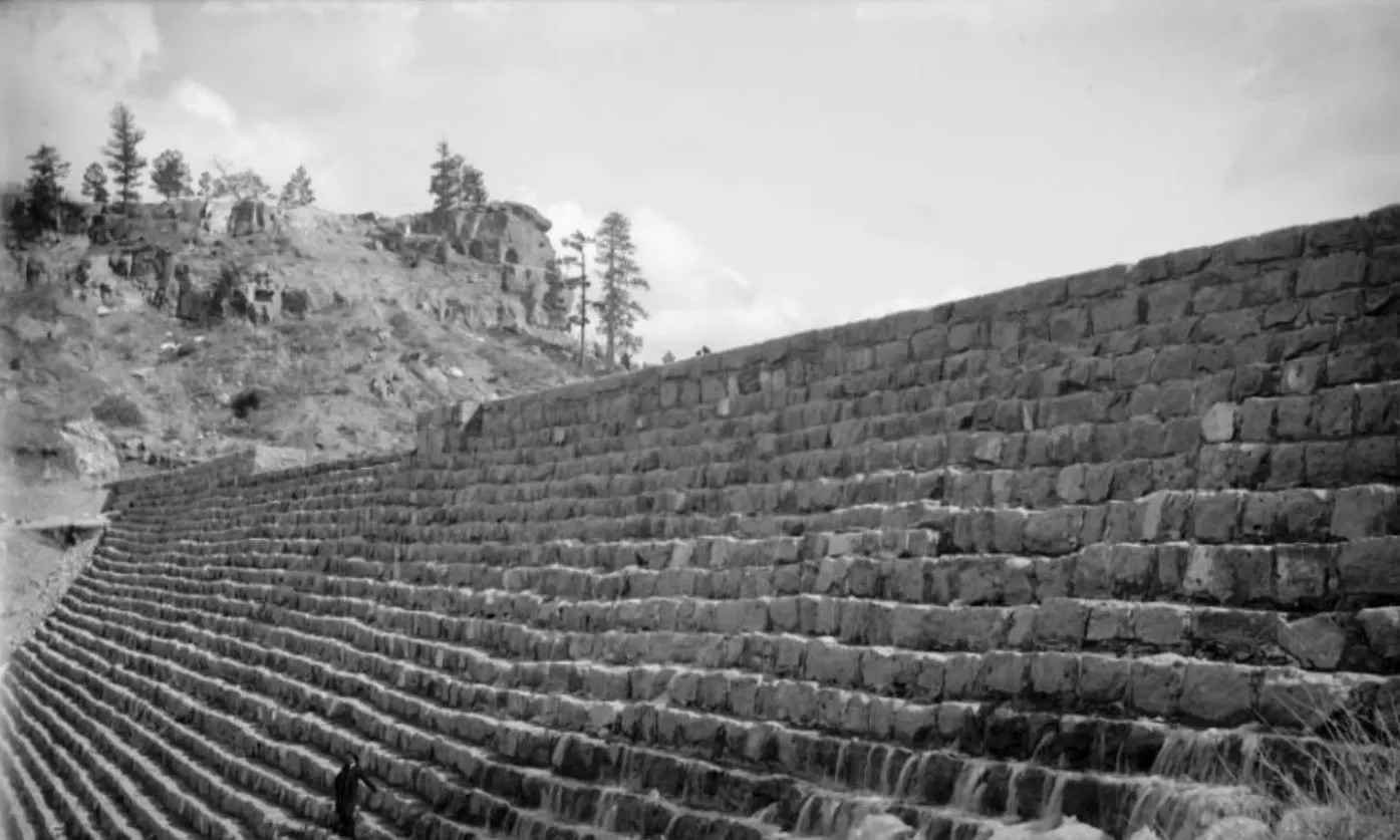 The potential for that profit is what had brought the dam into being: The project was the concept of the Denver Water Storage Company, in partnership with Denver Land and Water, two of many hydro-pioneers that would give way in 1918 to the municipal entity still called Denver Water today. Back then, they figured that if they built it, farmers and businesses would come – and they were right. The dam itself was designed by chief engineer A.M. Welles and constructed in a rock-fill strategy composed of two freestanding walls: a straight wall on the reservoir end and a stepped wall on the other. It was built entirely by hand by over 300 men and 180 teams of horses over 11 months; when finished, it was 600 feet across, 70 feet tall, 8 feet thick at its top and 50 feet deep at its base.