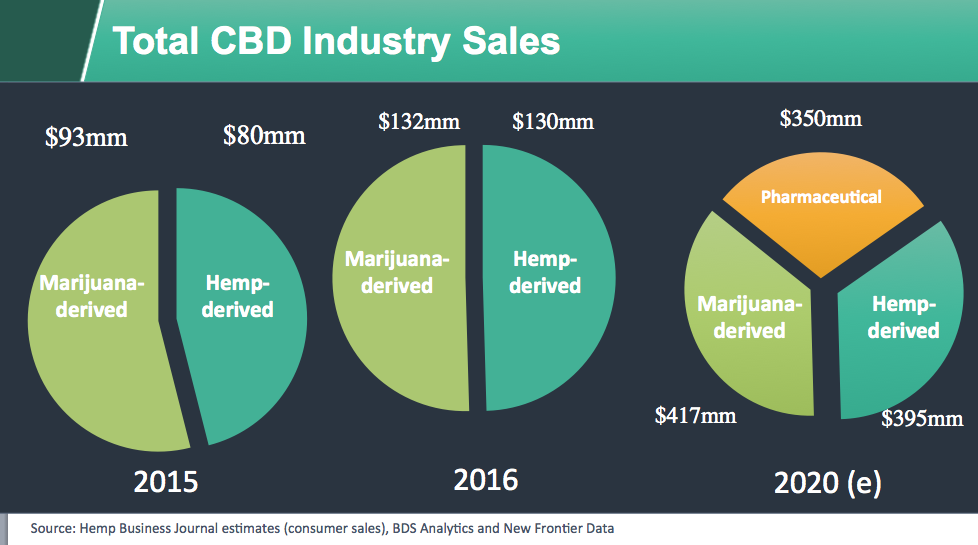 According to the report, marijuana-derived CBD products currently hold a slight edge that is rapidly losing ground to hemp-derived sales. By 2020, when more pharmaceutical companies enter the market, those numbers are expected to change even more.