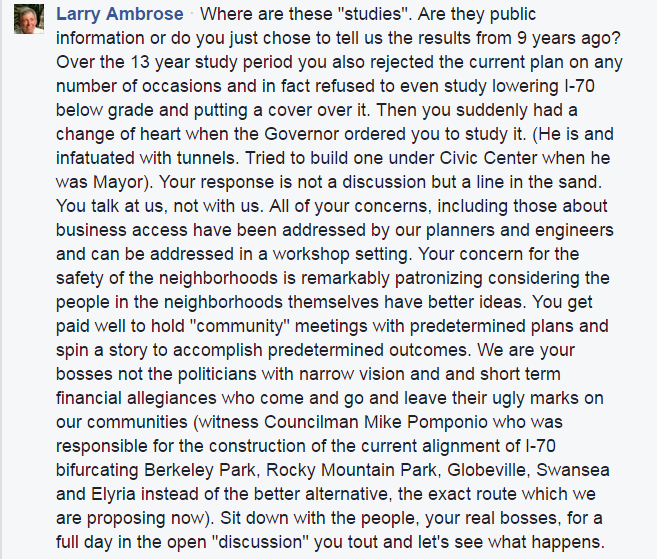 Many of the opponents have pushed for re-routing the highway farther north, along the 270 corridor. But CDOT officials have maintained that their own studies of that alternative indicated it would involve costly changes at several major interchanges and create additional mobility issues. That led to heated responses from neighborhood activists, including this one from former mayoral candidate Larry Ambrose:
