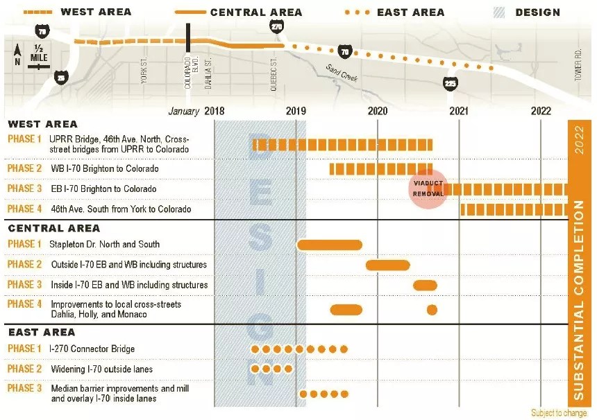 Even CDOT acknowledges that its predictions involve some guesswork. The department’s timeline, one of several images on view below, links the year 2022 with the phrase “Substantial Completion,” which provides a high degree of wiggle room. After all, being 51 percent finished by then might qualify under that definition. And in smaller print beneath these words is an acknowledgement that the estimates are “Subject to Change.”