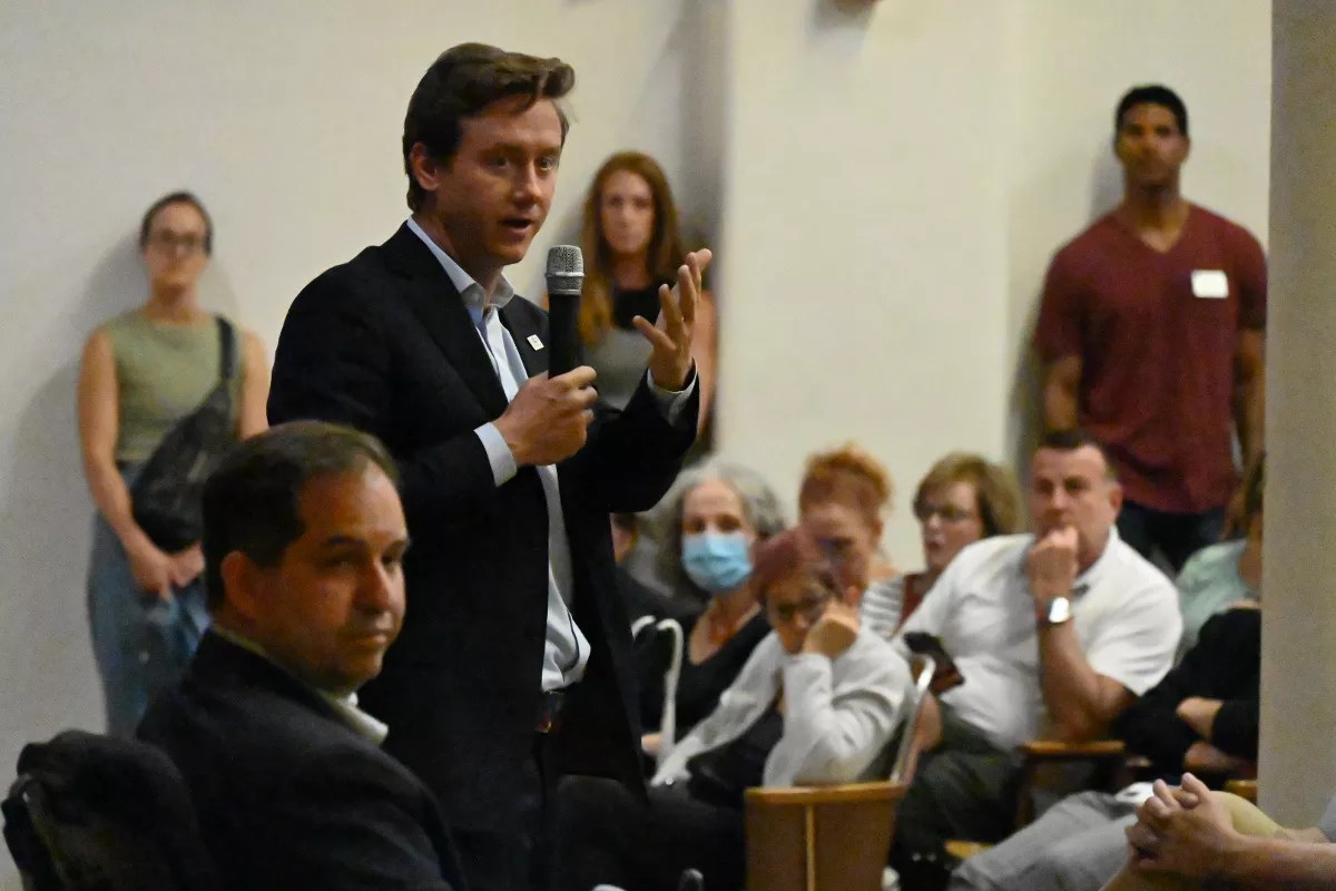 Mayor Mike Johnston talks to Golden Triangle residents who attended a town hall on September 28 to talk about micro-communities in their neighborhood.