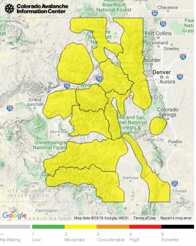 The areas in yellow on the map are rated as moderate, defined as: “Heightened avalanche conditions on specific terrain features. Evaluate snow and terrain carefully.”