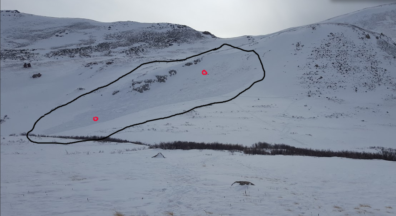 The Colorado Avalanche Information Center caption on this photo-illustration depicting the November 28 slide reads: “Skier 1 was near the upper red dot when the avalanche released, and was buried near the lower dot. Skiers 2 and 3 were climbing on foot through the wind-blown scree on the right of the photo. Image and annotations provided by the party.”