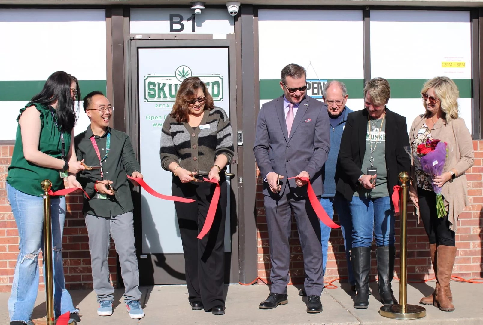 (From left) Skunked general manager Micki Rodpai; Thornton City Council members Karen Bigelow and Adam Matkowsky; and Skunked co-owner Stephanie Hull cut the ribbon during Skunked’s grand opening.