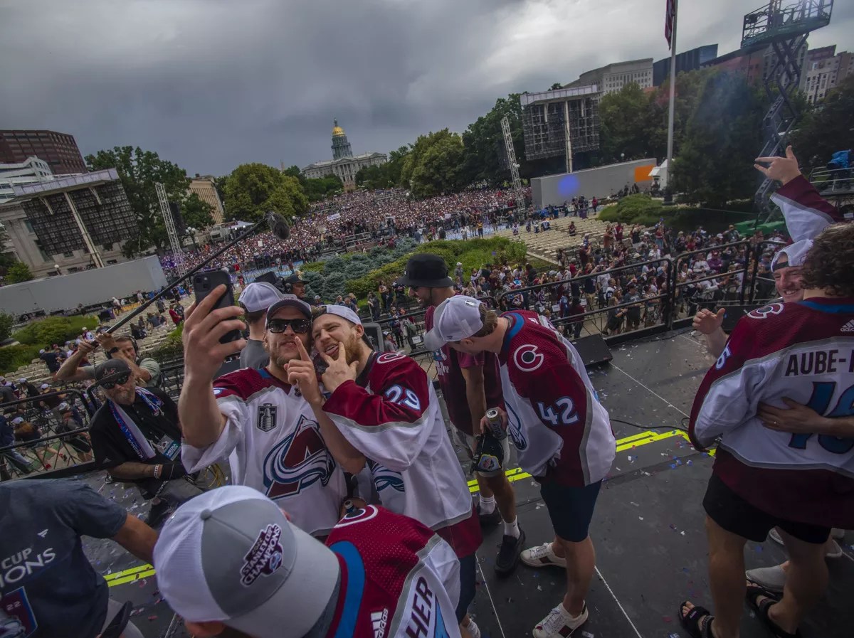 Mikko Rantanen, left, and Nathan MacKinnon after the Avs won the Stanley Cup in 2022.
