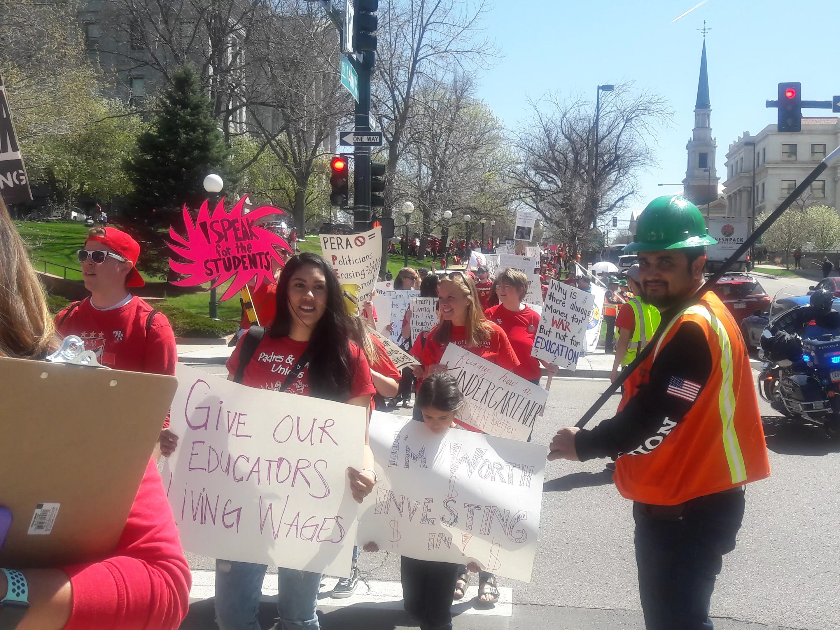 The two-day protest at the Capitol comes on the heels of a national uprising of public school educators to pressure their state representatives to put more money into their crumbling public education systems. It started with West Virginia when all 55 of its school districts shut down and went on strike for nine days, which ended in that state’s governor signing a bill for a 5 percent pay increase for all state employees, including teachers. Soon after, teachers in Oklahoma and Kentucky joined in to lobby their statehouses for higher wages, more school funding and pension reform. And most recently, thousands of Arizona teachers have been picketing since Thursday.