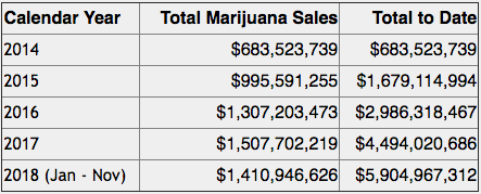 With one month of 2018 left to report, Colorado marijuana sales last year are on track to surpass 2017’s, according to the state Department of Revenue. But just barely.
