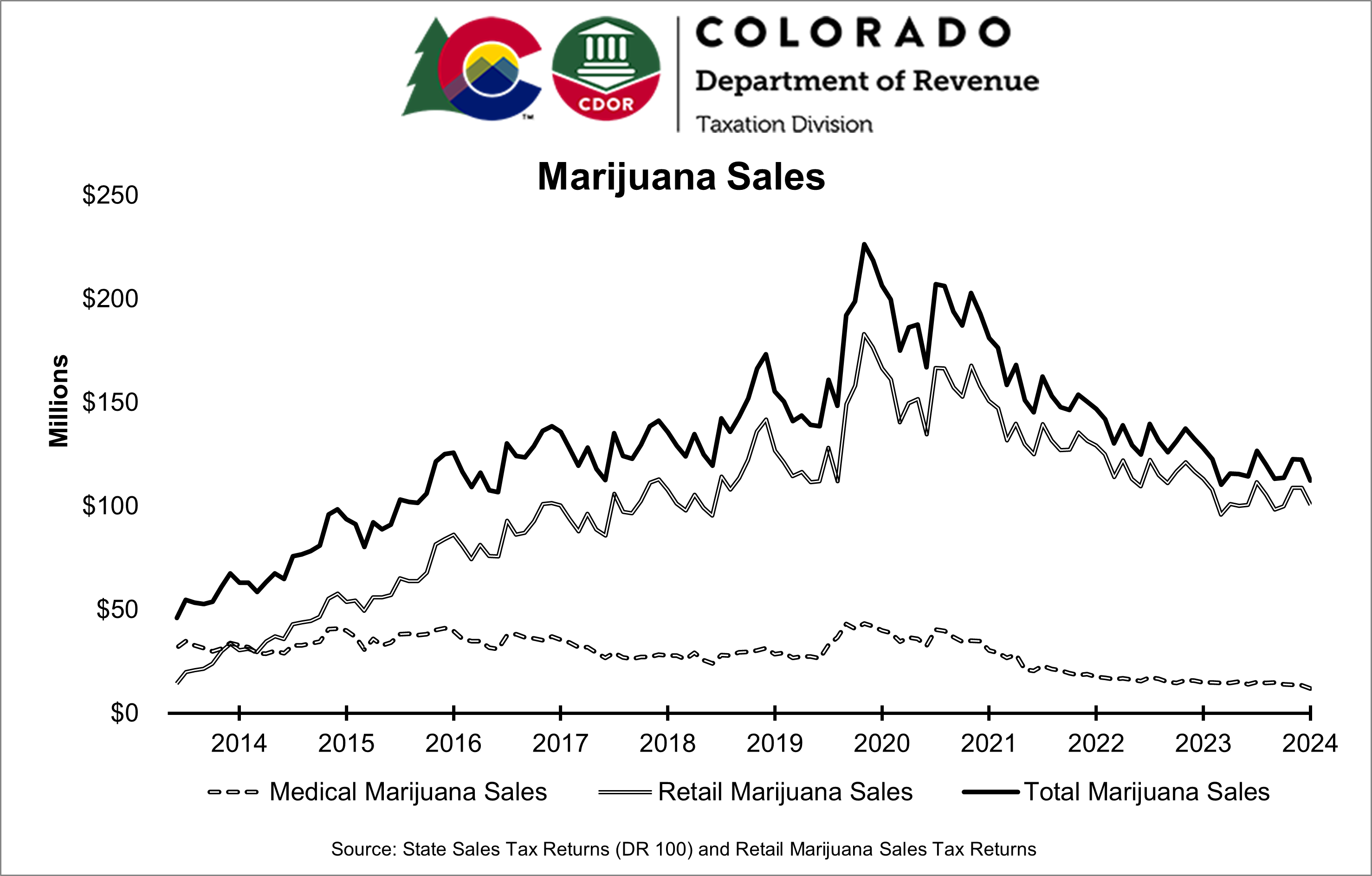 After increasing for seven straight years to a record $2.2 billion in 2021, annual marijuana sales have been free-falling in Colorado, hitting just over $1.5 billion for 2023. Based on the first ten months of this year, dispensaries are on pace to collect around $1.3 billion in 2024, according to DOR marijuana sales reports.