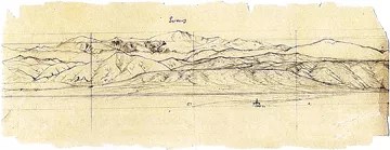 Bierstadt hastily sketched the panorama before him as a bitterly cold wind blew down from the northwest and would soon force them to head down. They camped at Summit Lake that evening and continued their descent on June 20, encountering a blinding snowstorm such as Byers was accustomed to seeing only in the winter. Upon retiring for the evening, they discovered their blankets were encased in ice. Despite the snow and cold, Bierstadt busied himself with sketching the surroundings from various points.