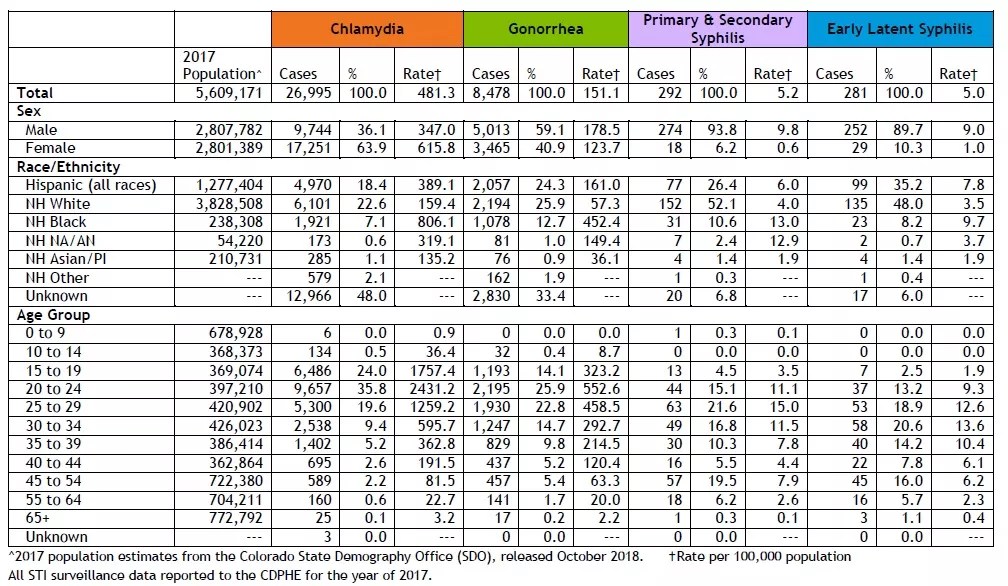 The CDPHE document’s executive summary underscores this point. In 2017, there were 36,291 newly reported STI cases: 26,995 involving chlamydia, 8,478 pertaining to gonorrhea and 818 dealing with all stages of syphilis. Those are the highest figures ever recorded in the state for each of the three conditions.