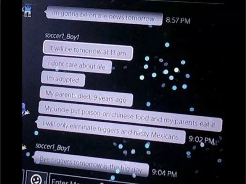 As you can see, the comments include a mixture of general threats and racially offensive ones: “Im gonna be on the news tomorrow,” “it will be tomorrow at 11 am,” “I dont care about life,” “Im adopted,” “My parents died, 9 years ago,” “My uncle put poison on chinese food and my parents eat it,” “I will only eliminate niggers and nasty Mexicans” and “Bye niggers tomorrow is the big day.”