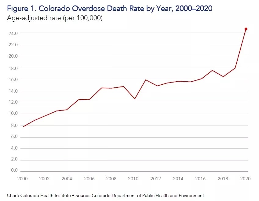 This graphic demonstrates that overdose deaths were rising in Colorado long before a controversial 2019 bill became law.