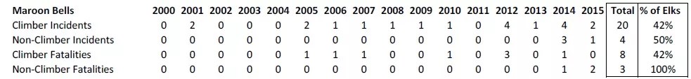 Still, he adds, “The Elk Mountains are among the least frequently climbed fourteeners in the state, but are disproportionately more likely to be the scene of fatalities due to their more technical nature and their notoriously loose rock. Even within this range, the most popular fourteener [Castle and nearby sub-peak Conundrum] is the least likely to see accidents/fatalities.”