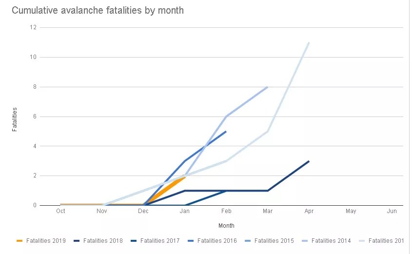 This graphic shows the number of avalanche fatalities in Colorado per month from 2013 to January 2019.