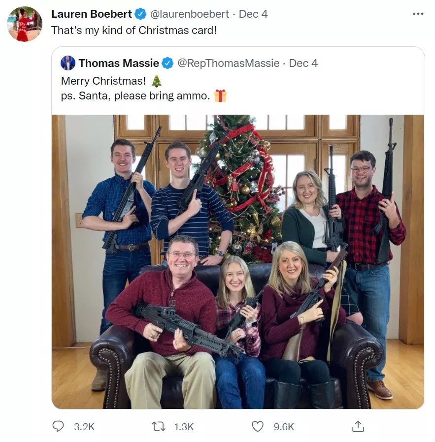 This particular photo was a response to a stupefying holiday message from Kentucky Representative Thomas Massie, who may not be as loud as Boebert, but could be just as in love with ignorance – he called John Kerry’s position on climate science “pseudoscience,” introduced a bill to abolish the U.S. Department of Education, and signed on to Florida Representative Matt Gaetz’s bill to eliminate the EPA. And last week, shortly after a kid with tragic access to guns killed four and injured seven in a Michigan school shooting, Massie posted a photo of his own heavily armed family in front of their Christmas tree, asking Santa to “bring ammo.”