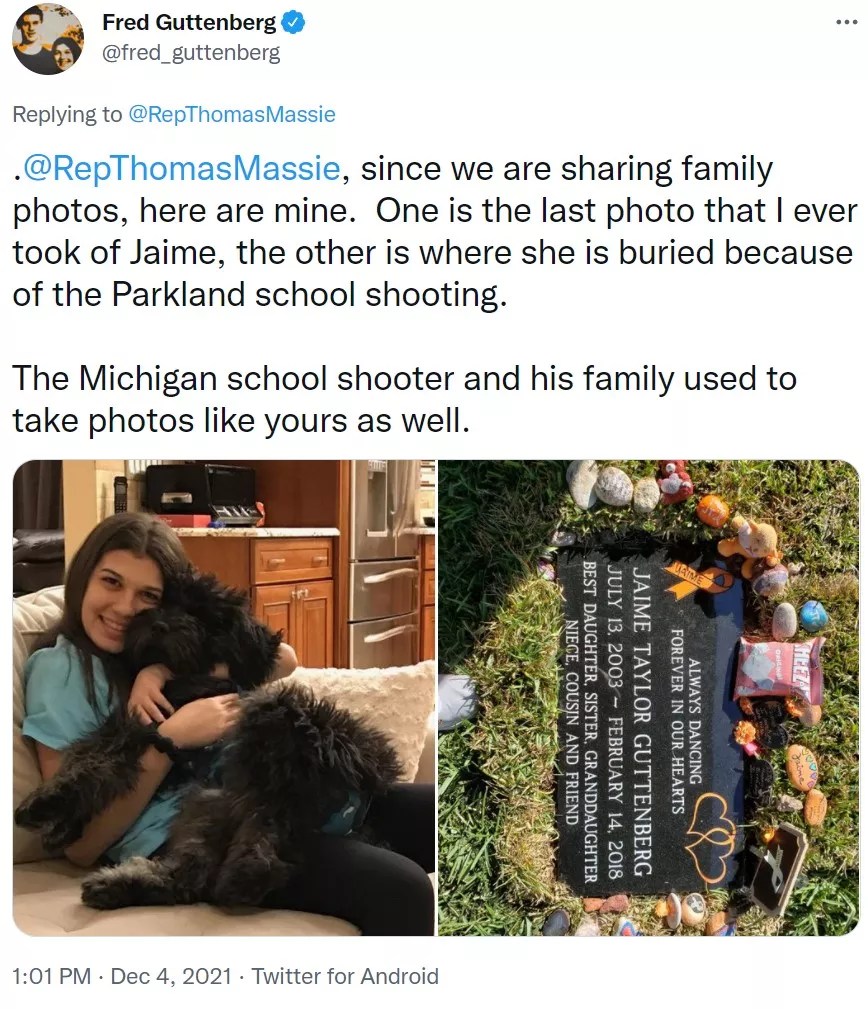 A better response – and one more in keeping with the majority of Americans – came from Fred Guttenberg, the activist against gun violence whose daughter Jaime was killed in the Parkland, Florida, shooting in 2018. “Since we are sharing family photos,” Guttenberg posted to Twitter, “here are mine. One is the last photo that I ever took of Jaime, the other is where she is buried because of the Parkland school shooting. The Michigan school shooter and his family used to take photos like yours as well.”