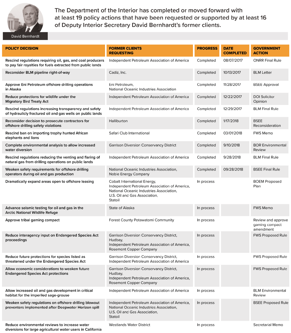 Even before Trump nominated Bernhardt, CWP came up with a list of nineteen actions by him that the organization sees as representing such conflicts, as seen in the following graphic.