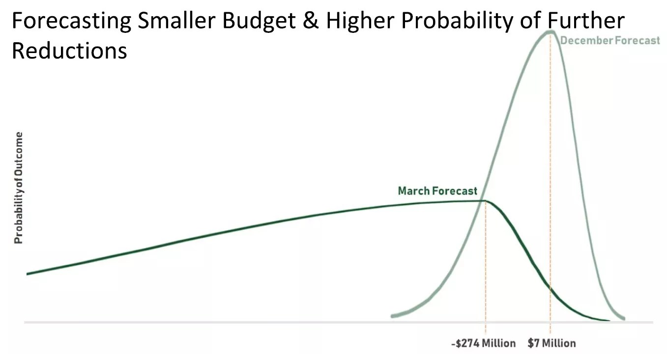 “Downward revenue revision means less budget available,” Larson and Teater point out – and the repercussions of this statement can be seen in the following simulation, which boasts an ominous figure: -$274 million.