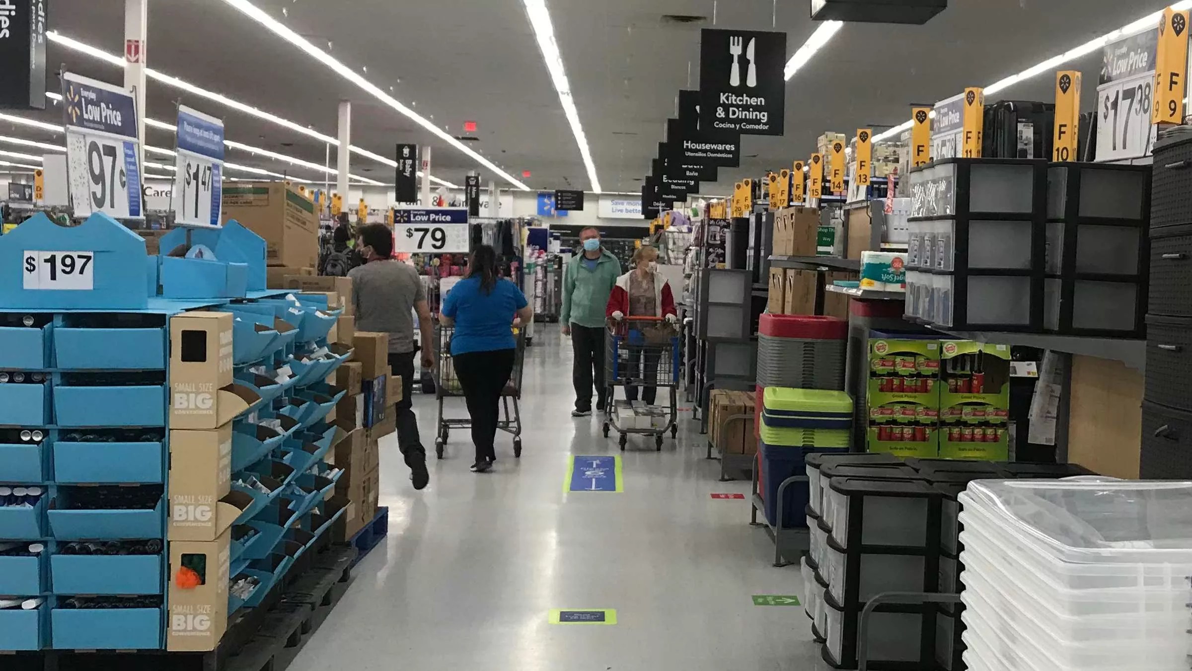Inside the Walmart, floor stickers helped customers maintain proper social distancing.