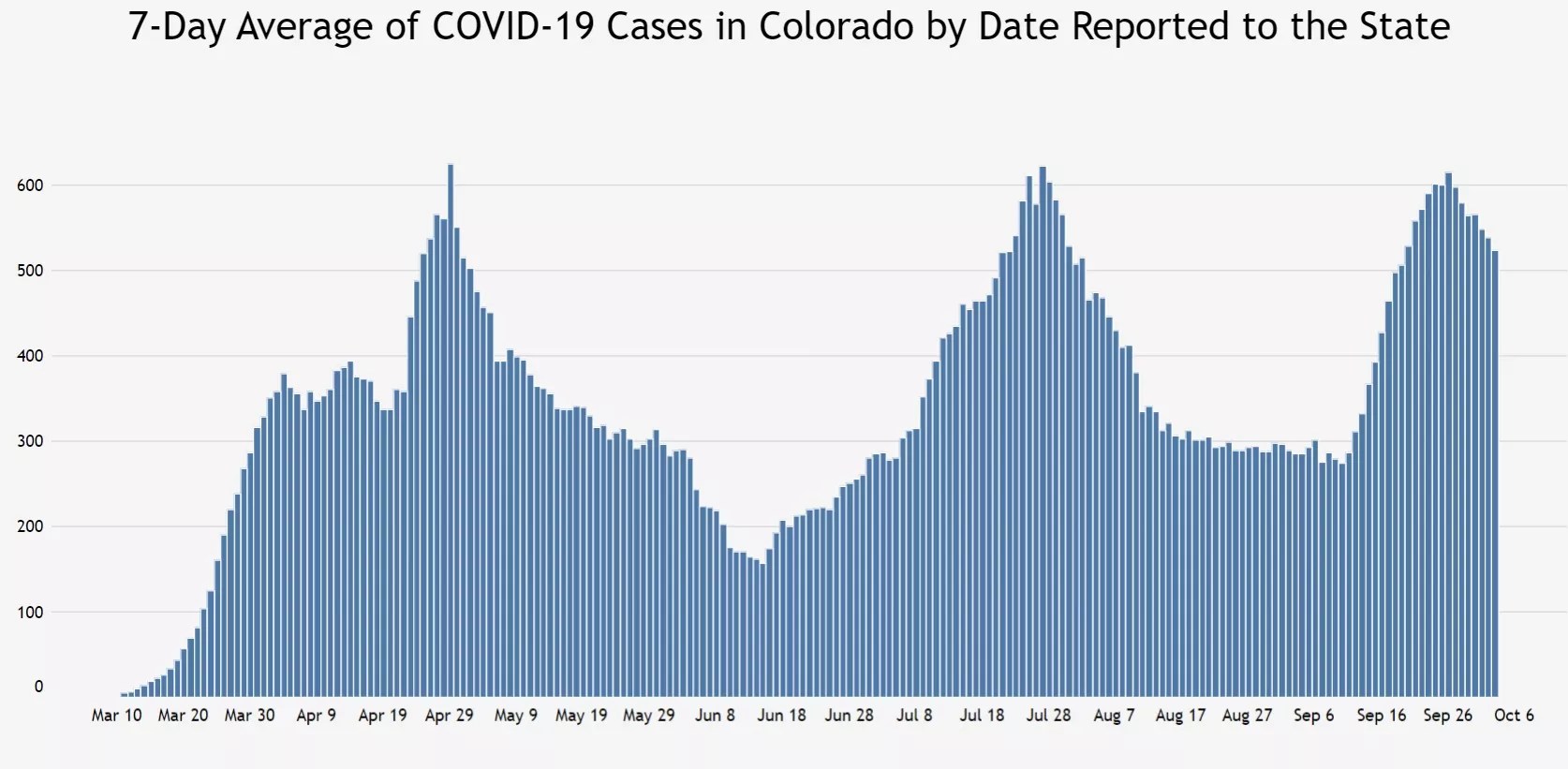 Even more concerning is the trend in hospitalizations. During an October 2 press conference, Governor Jared Polis revealed that the number of admissions to medical facilities because of the novel coronavirus had topped 200 for the first time since August 9, and was nearly double the 120 people hospitalized just two weeks earlier. As of October 4, that total had exceeded 300.