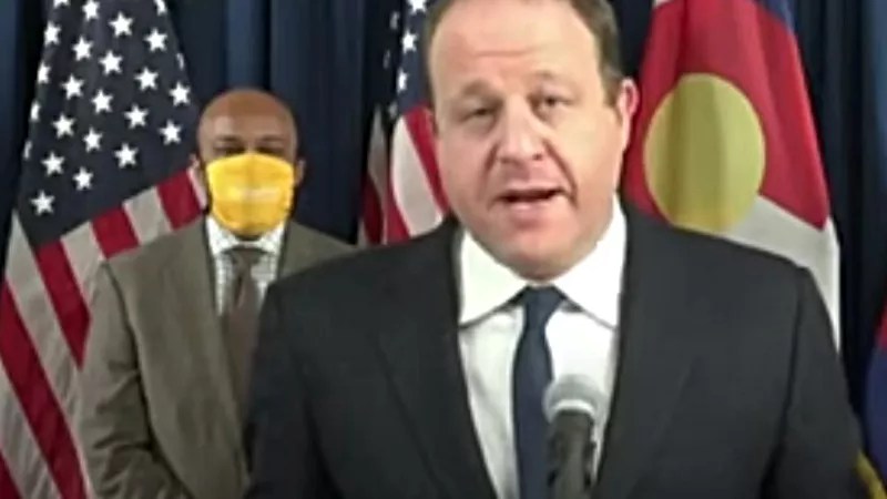 Governor Jared Polis during a November 17 press conference, with a masked Mayor Michael Hancock in the background.