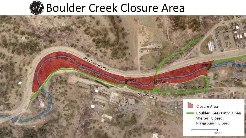 While Eben G. Fine Park, a Boulder park, will technically remain open, there will be no access to park land (and the creek bed) north of the Boulder Creek path “due to public health and safety concerns, and in an effort to prevent large gatherings and ensure proper physical distancing,” Boulder announced. “This closure is intended to reduce the community spread of COVID-19 in an area shown as conducive to social gathering and large groups exceeding current Safer at Home orders.”